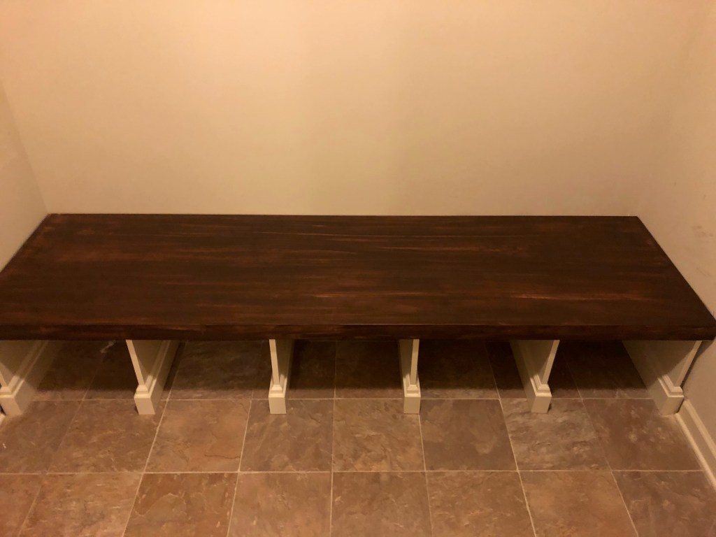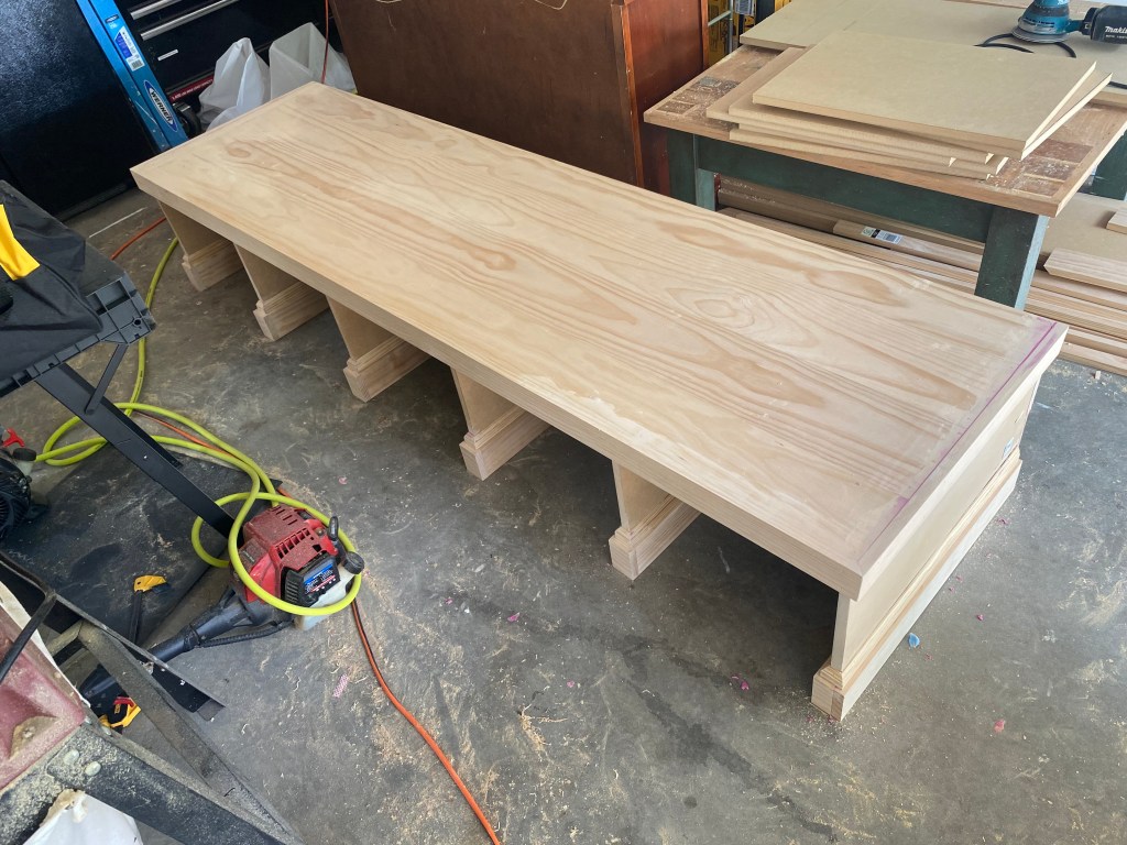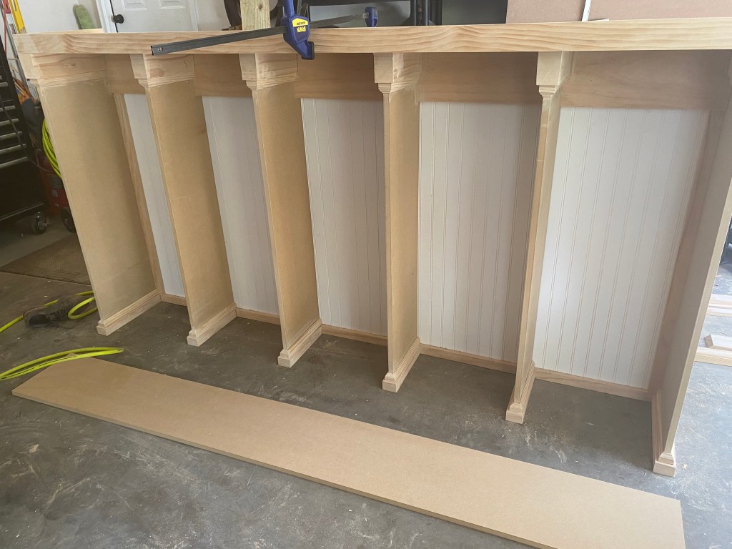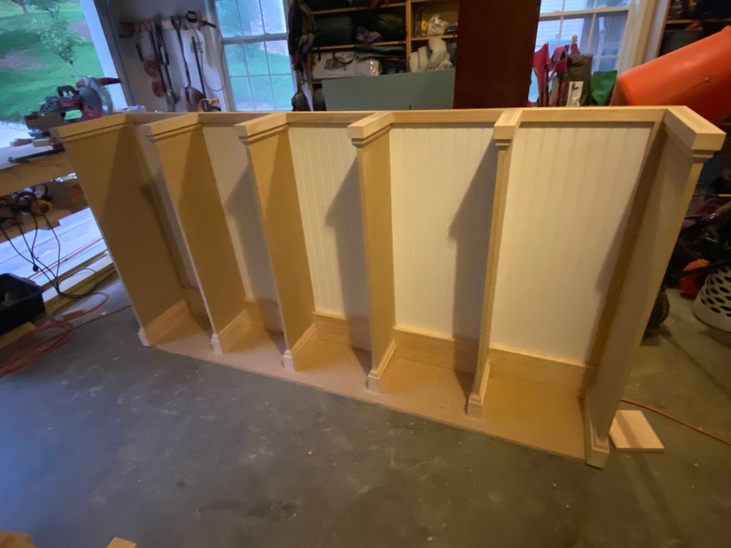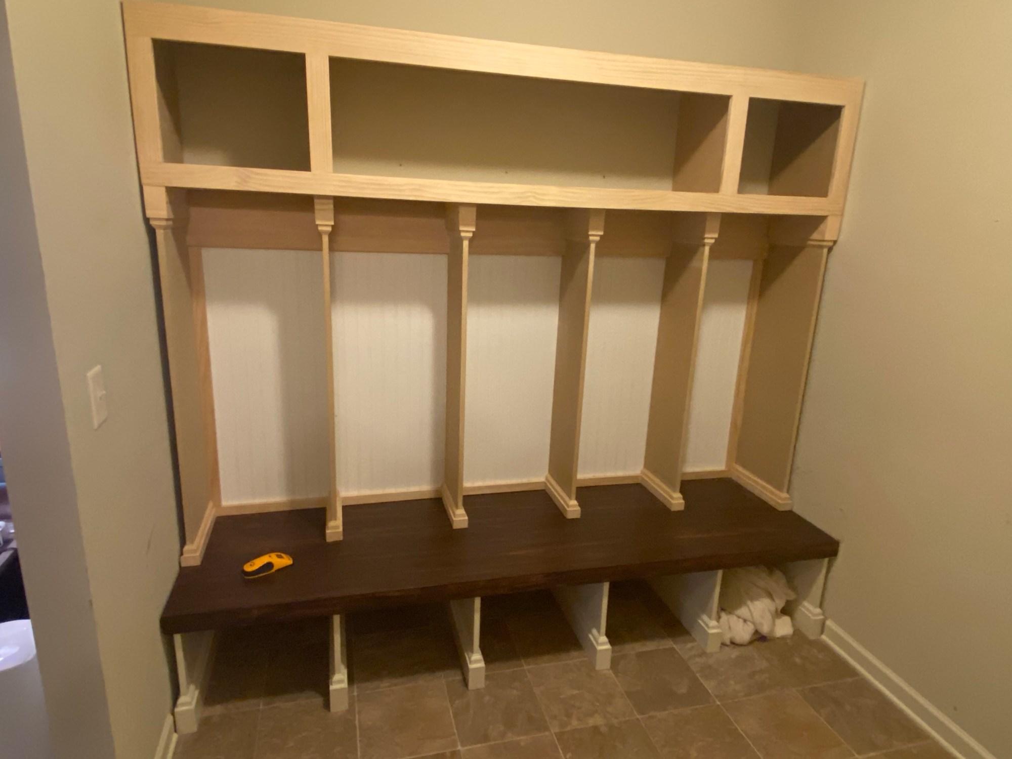 Custom mudroom cabinet approx 102in long, 80in tall. Bench portion is made of white pine. Main cabinet construction: MDF with bead board backing and crown molding. This project was painted after installation into the home.