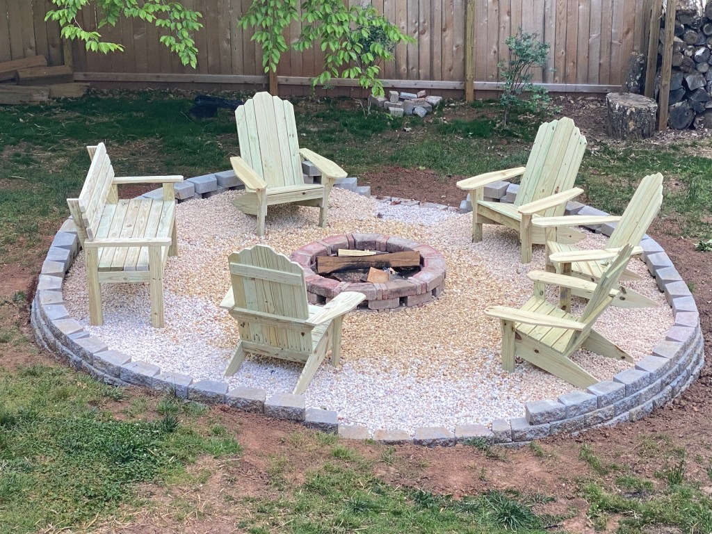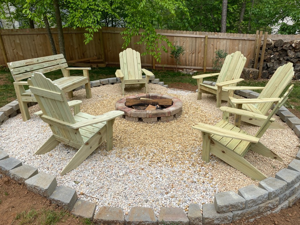 Large bench seat (seats 4 adults comfortably) and adirondack chairs made of pressure treated pine, unfinished (not painted or stained).