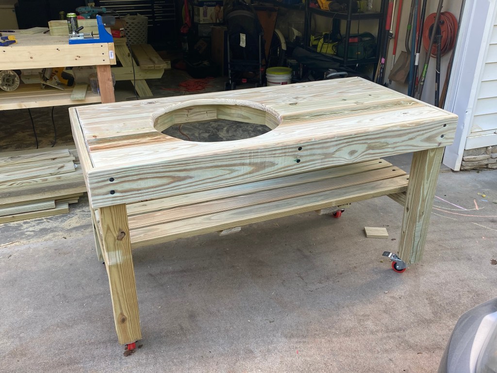 Smoker table designed for Green Egg smoker. Made of pressure treated pine, unfinished (no stain or paint). Top has prep space with lower shelf for additional storage. Placed on heavy duty casters for easy moving.